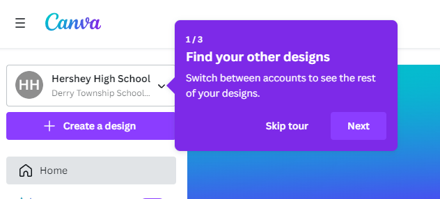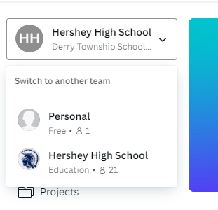 In Canva, organization are called Teams. For example, if you used Canva before with your email address, you might have a Hershey High School team and a Personal team. Please follow the instructions below to change your team: